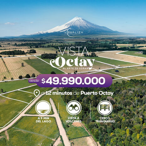 Vista Octay combina naturaleza y diseño moderno en parcelas con vistas a los volcanes, a minutos del Lago Llanquihue. Inversión estratégica con luz soterrada, agua certificada, fibra óptica y rol propio. Desarrollo de Visualiza que ofrece seguridad, conectividad y plusvalía. Incluye acceso premium, paisajismo nativo, reciclaje, seguridad 24/7 y más. Agenda tu visita y descubre por qué Vista Octay es tu punto de partida en el sur de Chile. 🌲🏞️